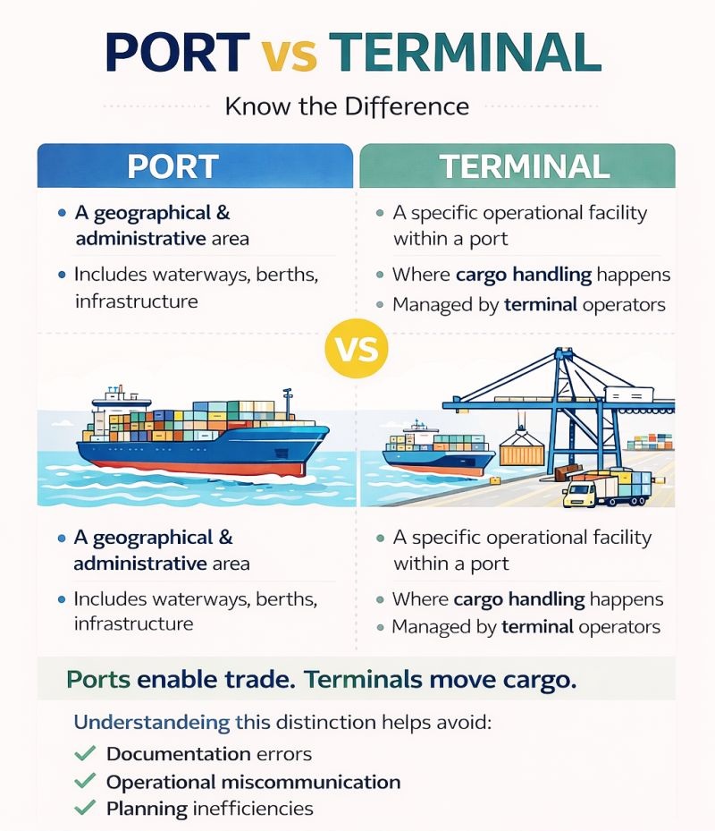 Terminal = bagian kecil dari port yang fokus ke operasional (bongkar muat)